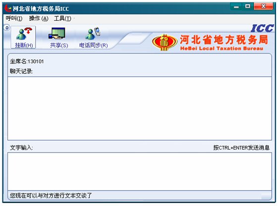 5. 點(diǎn)擊應(yīng)答按鈕后,應(yīng)答按鈕變?yōu)閽鞌喟粹o,并且左下角的狀態(tài)欄文字提示首先變?yōu)椤澳F(xiàn)在可以與對方進(jìn)行文本交談了”,從現(xiàn)在開始到坐席掛斷呼叫期間,坐席就可以和納稅人進(jìn)行文本交談了。