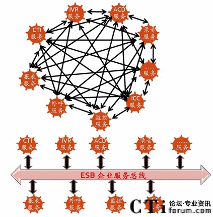 簡單一點(diǎn),下面兩種構(gòu)架的方式,第一種,雜亂無章,第二種,非常清晰,第二種用的就是ESB的方式。