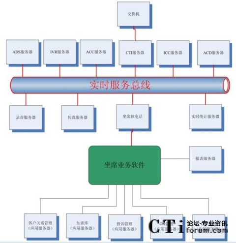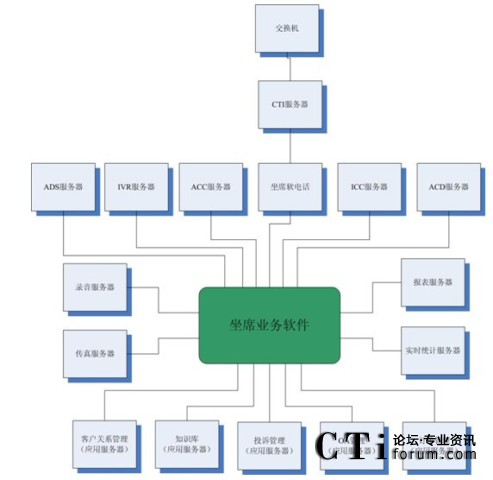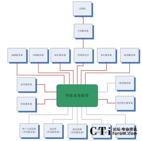 很多集成商或業(yè)務(wù)軟件開發(fā)商認(rèn)為這種結(jié)構(gòu)過于復(fù)雜,而他們自身往往提供“整體解決方案”,即所有的服務(wù)器軟件基本上都是自己的,根據(jù)客戶的要求修改即可。例如,客戶關(guān)系管理、知識(shí)庫(kù)、投訴管理、OA、訂單管理以及坐席軟電話、ADS服務(wù)器、IVR服務(wù)器、ACC服務(wù)器、ICC服務(wù)器、ACD服務(wù)器、錄音服務(wù)器、傳真服務(wù)器、報(bào)表服務(wù)器、實(shí)時(shí)統(tǒng)計(jì)服務(wù)器都是自己來做,那么對(duì)于很多接口環(huán)節(jié)都可以節(jié)省了。