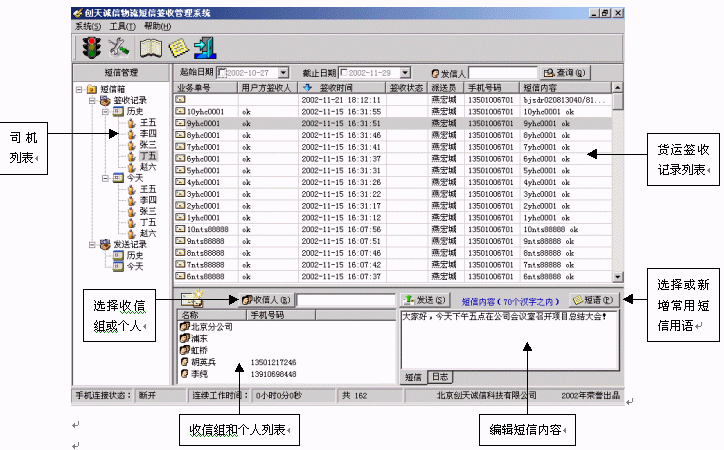我公司為了解決這個物流跟蹤問題,專門為物流企業(yè)開發(fā)了貨物簽收管理系統(tǒng)。物流公司的派送人員就可通過手機將貨物狀態(tài)及簽收信息實時發(fā)送給公司短信中心,短信中心的物流簽收系統(tǒng)會自動記錄,并可實時送達(dá)客戶或發(fā)布到公司網(wǎng)站上。其特色在于有效利用了手機短信技術(shù),解決了長期困擾物流企業(yè)的貨物簽收狀態(tài)實時管理問題。