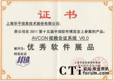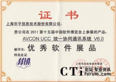CTI論壇(ctiforum)6月1日消息(記者 潘婷婷): 近日,由工業(yè)和信息化部、國(guó)家發(fā)展和改革委員會(huì)、科學(xué)技術(shù)部、國(guó)家外國(guó)專(zhuān)家局和北京市人民政府共同主辦,中國(guó)軟件行業(yè)協(xié)會(huì)、中國(guó)電子信息產(chǎn)業(yè)發(fā)展研究院等單位承辦的第十五屆中國(guó)國(guó)際軟件博覽會(huì)參評(píng)軟件產(chǎn)品評(píng)獎(jiǎng)揭曉,經(jīng)過(guò)專(zhuān)家組的嚴(yán)格評(píng)審及在技術(shù)領(lǐng)先性、應(yīng)用價(jià)值等評(píng)審指標(biāo)下,由上海市經(jīng)信委軟件展團(tuán)及上海市軟件行業(yè)協(xié)會(huì)共同頒發(fā)華平股份優(yōu)秀組織獎(jiǎng),所參展的 “AVCON UCC統(tǒng)一協(xié)同通訊系統(tǒng)V6.0”、“AVCON視頻會(huì)議系統(tǒng)V6.0”兩款產(chǎn)品被評(píng)為優(yōu)秀軟件展品。