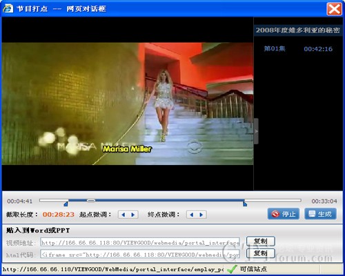 拖動(dòng)進(jìn)度條左右的打點(diǎn)按鈕可以設(shè)定片段的開始和結(jié)束時(shí)間點(diǎn),還可以點(diǎn)擊起點(diǎn)微調(diào)和重點(diǎn)微調(diào)的左右箭頭對(duì)截取的視頻進(jìn)行微調(diào),然后點(diǎn)擊“生成”,再點(diǎn)擊“復(fù)制”可以將截取的節(jié)目URL粘貼到WORD、PPT、BBS或BLOG等頁(yè)面中。
