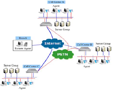 圖析:上圖中,整個分布式呼叫中心系統(tǒng)由三個獨立呼叫中心以及遠端座席構(gòu)成,彼此都通過Internet或者其它網(wǎng)絡互連。三個呼叫中心每個都是獨立完整的呼叫中心,在任何時候,都可以獨立工作,遠程座席則要注冊到某一呼叫中心上。