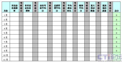 績效成績平均得分 | 此項指標(biāo)是考核客服中心整體工作水平的重要指標(biāo),計算方法為:績效成績總得分/考核總?cè)藬?shù)。 | 10 |