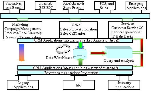 傳統(tǒng)的數(shù)據(jù)庫(kù)及中間件軟件廠商,都能提供一些“point solution”(指基于某一單獨(dú)技術(shù)領(lǐng)域),例如,單獨(dú)的客戶(hù)服務(wù)CallCenter方案,數(shù)據(jù)倉(cāng)庫(kù)/商業(yè)智能BI解決方案。Compaq向客戶(hù)提供的是完整的CRM方案套件,其技術(shù)組成主要包括前端的基于多種接觸媒體(phone,fax,email,web)CallCenter;核心部分的Sales Force Automation,Marketing Automation,Service Operation;以及后端的DataWareHouse/BI,ERP及原有集成應(yīng)用系統(tǒng)(Legacy Application)的集成等部分。通過(guò)下圖我們將詳細(xì)描述康柏的整體CRM方案框架及其解決方案: