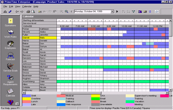 在這個模版中,顯示了員工Garret在1999年11月4日的個人日歷,里面體現(xiàn)了Garret從早上6:15到下午14:45的正常工作時間。