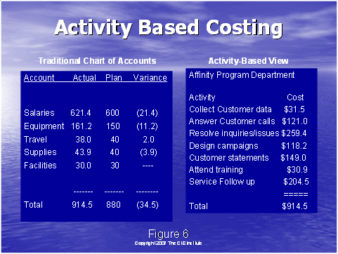 相關(guān)的是,使用傳統(tǒng)的成本和通過一種系統(tǒng)的合理的方式把該成本分配到各個(gè)行動上去。這是它們自身的科學(xué),如果你擁有數(shù)字的頭腦,你可以確定一個(gè)計(jì)劃,該計(jì)劃把企業(yè)的成本分配到圖6右手邊所示的不同的行動上去。這是一個(gè)關(guān)鍵的步驟。