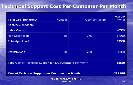 最后,我們可以如同下面圖表10所示,把所有的信息放在一起。每個客戶的技術(shù)支持的實際成本包括間接人工成本和工作場地成本,這是服務(wù)一個客戶所花費成本的正確的反映。