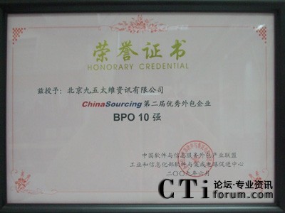 CTI論壇(ctiforum)06月16日消息: 日前,從國家工業(yè)和信息化部傳來喜訊:北京九五太維資訊有限公司2009年蟬聯(lián)“中國BPO企業(yè)10強”。