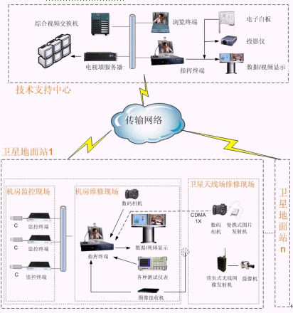 某通信部門為了解決高新技術(shù)設(shè)備的不斷增加和與之相適應(yīng)的技術(shù)維修力量嚴(yán)重不足的矛盾,最大限度地實現(xiàn)技術(shù)專家的資源共享,降低維修成本、提高工作效率,采用北京華緯訊電信技術(shù)有限公司研制、生產(chǎn)的VC3-6000視頻指揮調(diào)度系統(tǒng),建設(shè)了一套遠(yuǎn)程技術(shù)支持系統(tǒng),其組網(wǎng)拓?fù)鋱D見下圖。
