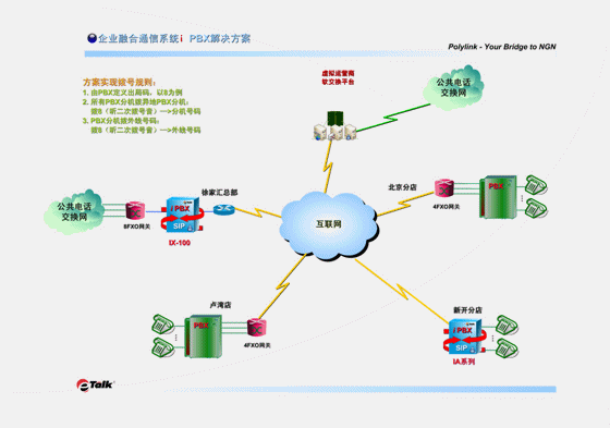 此方案實(shí)施后,用戶今后的VoIP分點(diǎn)擴(kuò)容會(huì)十分簡(jiǎn)單易行。當(dāng)用戶有新的分店時(shí),分店的通訊系統(tǒng)可以直接上一臺(tái)Polylink eTalk® IA系列i PBX,它既有與PBX相同而且更多的各種功能,還具有VOIP網(wǎng)關(guān)的功能,可直接與總部的IX系統(tǒng)互相注冊(cè),既省掉了多添置一臺(tái)語(yǔ)音網(wǎng)關(guān)的成本,也避免了設(shè)備的重復(fù)堆壘。