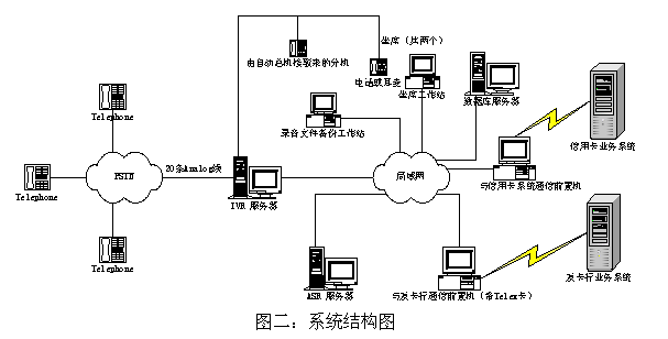 在硬件上系統(tǒng)由語音識別服務(wù)器、IVR服務(wù)器(含語音卡、坐席卡)、數(shù)據(jù)庫服務(wù)器、與發(fā)卡行業(yè)務(wù)系統(tǒng)通信前置機(jī)(含Telex卡)、與信用卡網(wǎng)絡(luò)系統(tǒng)通信前置機(jī)、坐席用工作站、錄音文件備份工作站以及相應(yīng)的連接設(shè)備組成。