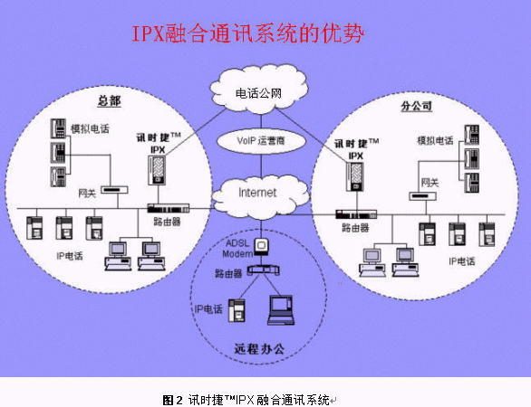 將訊時捷?IPX放在公司總部,其它分支機構可以通過IP話機,軟電話或者網(wǎng)關設備登錄到總部的IPX上,這樣就形成了整個公司的VOIP網(wǎng),建立了企業(yè)自己的通訊平臺。