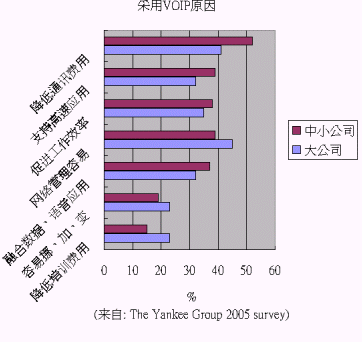 根據(jù)美國著名的咨詢公司 The Yankee Group 2005 年的調(diào)研各企業(yè)使用VOIP的原因,大企業(yè)與中小企業(yè)略有差異:大企業(yè)認為網(wǎng)絡管理、省錢、促進工作效率為最關鍵的三個原因;中小企業(yè)則認為省錢、網(wǎng)絡管理容易、支持高速應用、促進工作效率為主要原因。