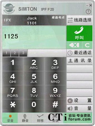 企業(yè)版需要另行購(gòu)買,突出的功能包括“電子通信錄”、“軟電話與臺(tái)式電話機(jī)綁定”等。“電子通訊錄”功能已預(yù)裝在軟電話中,就像手機(jī)的通訊薄一樣。企業(yè)的員工不需要自己逐條輸入通訊錄,錄入與更新由企業(yè)的系統(tǒng)管理員在企業(yè)的通訊服務(wù)器上進(jìn)行,一人操作,全公司通訊錄同步更新。一個(gè)集團(tuán)公司或政府機(jī)構(gòu)有成百上千個(gè)員工很正常,但要讓大家記住這幾百個(gè)電話號(hào)碼就很困難了,目前較為常見(jiàn)的解決辦法有以下幾種,小一點(diǎn)的企業(yè)或機(jī)構(gòu)通常會(huì)打印一張通訊錄發(fā)放給每個(gè)員工,員工撥號(hào)前會(huì)先查一下這張通訊錄然后再將電話號(hào)碼在臺(tái)式辦公電話機(jī)上逐個(gè)輸入;規(guī)模大一點(diǎn)的企業(yè)會(huì)專門印制一本通訊薄發(fā)給每個(gè)員工,但由于機(jī)構(gòu)龐大,往往等到通訊簿發(fā)到手上,其中有很多電話號(hào)碼已經(jīng)不正確了。F20型軟電話的“與臺(tái)式電話機(jī)綁定”功能就很好的解決了這個(gè)問(wèn)題,通過(guò)將電腦上的軟電話與辦公桌上的臺(tái)式電話機(jī)進(jìn)行綁定,企業(yè)中的所有員工在打電話時(shí),都可以先點(diǎn)擊電腦軟電話中的通訊錄,快速找到需要的電話號(hào)碼,然后只需點(diǎn)擊這個(gè)號(hào)碼條,這個(gè)員工的臺(tái)式電話機(jī)就會(huì)自動(dòng)向目標(biāo)電話進(jìn)行撥號(hào),待對(duì)方摘機(jī)后,這個(gè)員工的臺(tái)式電話機(jī)就會(huì)響起鈴聲,此時(shí)摘機(jī)就可進(jìn)行通話了。確實(shí)夠方便,夠?qū)嵱茫?
