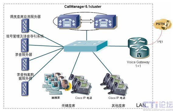 正音科技電話控制調(diào)度系統(tǒng)充分利用現(xiàn)有首都機(jī)場(chǎng)的IP網(wǎng)絡(luò)及通信資源,以IP電話系統(tǒng)為基礎(chǔ),構(gòu)建電話調(diào)度系統(tǒng)基礎(chǔ)網(wǎng)絡(luò)。電話控制系統(tǒng)主要由兩部分組成,其中包括由CallManager、語(yǔ)音網(wǎng)關(guān)、IP電話構(gòu)成的底層IP通信系統(tǒng);在此基礎(chǔ)上,還有正音科技為首都國(guó)際機(jī)場(chǎng)開(kāi)發(fā)的電話調(diào)度控制應(yīng)用軟件系統(tǒng)以及與應(yīng)急救援警示系統(tǒng)等集成的接口。