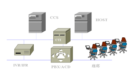 智能化網(wǎng)絡(luò)(Intelligent Network)、排隊(duì)機(jī)(ACD)、計(jì)算機(jī)語(yǔ)音集成(CTI)、自動(dòng)語(yǔ)音/傳真響應(yīng)設(shè)備(IVR/IFR)、業(yè)務(wù)系統(tǒng)主機(jī)HOST、座席(Agent)、信息板(Wall