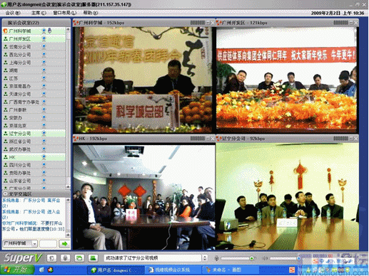 春節(jié)是中華民族的傳統(tǒng)的節(jié)日,尤其是跨國企業(yè)集團,身在海外的游子們,這一刻多么期待與在國內的親人、朋友、以及同事網(wǎng)絡“面對面”的過春節(jié);因此,一些企業(yè)用視維視頻會議舉辦了別開生面的視頻拜年會。其中京信通信公司視頻年會尤為精彩,廣州科學城的主會場、廣州開發(fā)區(qū)、香港、北京、上海、西北分公司、武漢等20多個分公司通過視維視頻會議互拜大年,通過網(wǎng)絡視頻,遠隔千里一樣可以“面對面”的送上新春祝福。如下圖: