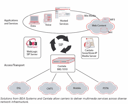 BEA提供領(lǐng)先的SOA基礎(chǔ)架構(gòu),同時(shí)它還提供可以在即使是完全不同的IT環(huán)境中建立應(yīng)用和管理SOA的強(qiáng)大的、 基于標(biāo)準(zhǔn)的平臺(tái)。BEA WebLogic Communications Platform (WebLogic 通信平臺(tái))是第一個(gè)提供在運(yùn)營(yíng)商級(jí)環(huán)境中、全業(yè)務(wù)功能的融合IT和電信的平臺(tái)。它使得運(yùn)營(yíng)商可以通過加強(qiáng)利用固網(wǎng)和無(wú)線網(wǎng)開展多樣的數(shù)字內(nèi)容和視頻服務(wù)的能力,從而增加收入。其WebLogic SIP 服務(wù)器提供了必需的呼叫建立和會(huì)話管理,但是,運(yùn)營(yíng)商仍然需要高級(jí)的媒體處理能力,以及能夠與BEA 解決方案進(jìn)行互操作的標(biāo)準(zhǔn)接口,從而使得運(yùn)營(yíng)商可以提供可擴(kuò)展的語(yǔ)音、視頻和多媒體服務(wù)。他們同時(shí)需要有媒體網(wǎng)關(guān)以實(shí)現(xiàn)跨網(wǎng)絡(luò)的連接。Cantata與BEA Systems 合作,提供與BEA的WebLogic SIP服務(wù)器可靠的交互操作性,同時(shí),運(yùn)營(yíng)商可以利用Cantata的SnowShore IP媒體服務(wù)器以及集成媒體網(wǎng)關(guān)1010實(shí)現(xiàn)跨固網(wǎng)和無(wú)線網(wǎng)語(yǔ)音和多媒體服務(wù)。