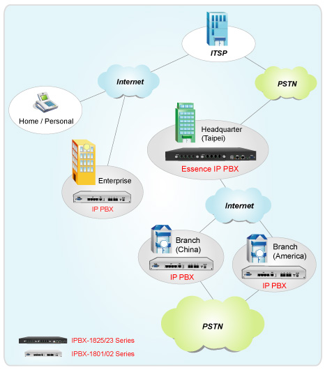 Essence IPBX系列可以注冊者之形式注冊于其他SIP協(xié)定伺服器上,如ITSP運營平臺,或是分公司之小型IP PBX注冊至總公司之大型IP PBX ,均可透過Internet 將話務(wù)無限延伸。