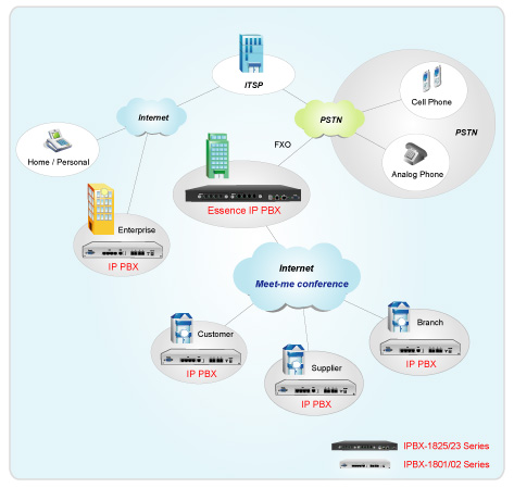 如圖所示,Essence IPBX 系列可透過內(nèi)建之FXO或是ISDN接口與公共電話網(wǎng)(PSTN)或基于傳統(tǒng)PBX的企業(yè)電話網(wǎng)連接在一起。