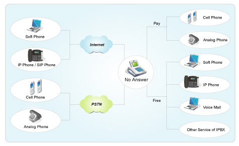 Essence IP-PBX的所有用戶均可透過內(nèi)部撥號方式之設(shè)定( Dialing Plan)將話務(wù)在不改變撥號習(xí)慣之前提下,經(jīng)由Internet導(dǎo)向外部ITSP服務(wù)商,再連接PSTN電話。
