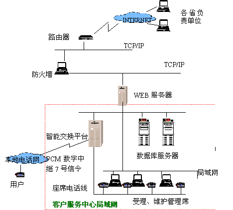 數(shù)據(jù)通信局的客戶遍布全國各地,建立一個覆蓋全國的客戶服務網(wǎng)絡勢在必行,因此我公司為之構建了數(shù)據(jù)通信局客戶服務系統(tǒng),全國各地的各個客服中心的數(shù)據(jù)可以通過專線連接,語音也可以通過VOIP用數(shù)字專線連接,以降低長話費用。該系統(tǒng)的投入使用,不但滿足了數(shù)據(jù)局為全國各地客戶服務的需要,而且可以收集客戶信息,不但降低了辦公費用,而且有利于擴大市場分額。數(shù)據(jù)通信客戶服務中心的主要目的是解決對全國大客戶的業(yè)務咨詢與申辦、障礙申告、投訴與建議的集中管理以及處理控制,系統(tǒng)采用800號接入,以一個小型的交換設備為座席電話分配點,客戶撥入的電話,經(jīng)小型交換設備分配到空閑的座席上。