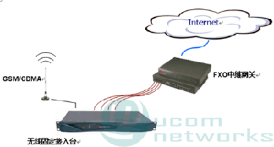 本方案采用FXO中繼語音網(wǎng)關(guān)接入互聯(lián)網(wǎng),由當(dāng)?shù)仄胀M電話線路落地對接網(wǎng)關(guān)FXO口,采用電話卡綁定網(wǎng)關(guān)預(yù)付費(fèi)計(jì)費(fèi)實(shí)現(xiàn)運(yùn)營。落地線路接入可以使用本地固定PSTN線路,也可以轉(zhuǎn)制無線電話,采用固定臺(tái)接入,2種拓?fù)鋱D如下所示。