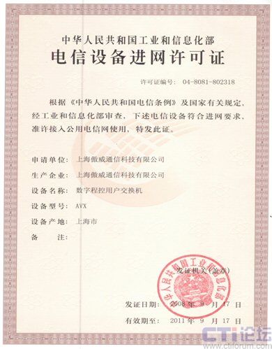近日,國內(nèi)知名的VOIP全系列產(chǎn)品和解決方案提供商---傲威通信科技有限公司,自主研發(fā)的AVX系列語音電話交換機(jī)順利通過工業(yè)與信息化部審核,取得“電信設(shè)備進(jìn)網(wǎng)許可證”。此舉標(biāo)志著傲威通信的AVX系列產(chǎn)品已成功取得接入國家電信網(wǎng)的資質(zhì),為大規(guī)模的推廣應(yīng)用打下了堅實(shí)基礎(chǔ)。