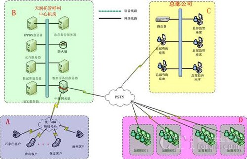總部部署電腦座席,各加盟校區(qū)一般部署電話座席,電話轉接可以通過按鍵直接完成。
