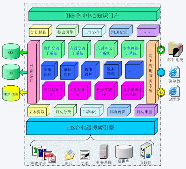 TRS Call Center 知識管理系統(tǒng)構(gòu)建在TRS企業(yè)級搜索引擎之上,融合了TRS文本挖掘技術(shù)和內(nèi)容管理技術(shù),全面包括知識庫、競爭情報(bào)、專家網(wǎng)絡(luò)、培訓(xùn)考試、溝通交流和協(xié)作交流六大子系統(tǒng),以及發(fā)布管理、審批管理、權(quán)限管理、版本控制等系統(tǒng)管理模塊;并集成面向用戶的網(wǎng)上咨詢服務(wù)系統(tǒng),提供面向客戶管理信息系統(tǒng)(CRM)、自動語音應(yīng)答系統(tǒng)(IVR)、Help