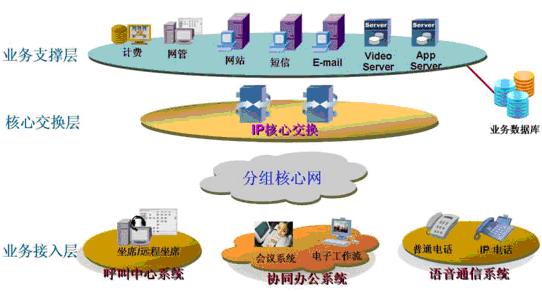 業(yè)務(wù)支撐層:計(jì)費(fèi)、網(wǎng)管、多媒體視頻、應(yīng)用服務(wù)器等各種功能服務(wù)器?膳c用戶的業(yè)務(wù)數(shù)據(jù)庫對接,為整個(gè)業(yè)務(wù)提供有力的支撐平臺。確保有效快速的處理呼叫流程、提高工作效率,評估呼叫中心的表現(xiàn)。