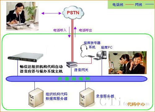 該系統(tǒng)以提高代碼辦服務(wù)質(zhì)量、完善服務(wù)措施為出發(fā)點,利用先進的計算機網(wǎng)絡(luò)和電話通信技術(shù),實現(xiàn)了自動語音咨詢、自動電話通知、自動短信通知等功能。用戶通過撥打咨詢電話就能實現(xiàn)自動語音咨詢,通過按鍵進入自動語音引導(dǎo)、自動語音播放、通話錄音、轉(zhuǎn)人工等服務(wù)。管理員還可以通過電腦網(wǎng)絡(luò)遠程操控管理系統(tǒng),使用自動外呼電話或自動發(fā)送短信的方式,向指定用戶發(fā)送代碼業(yè)務(wù)的相關(guān)提前告知信息。