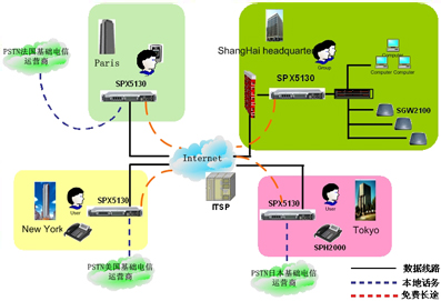 隨著公司在全世界開設眾多的部門,IP電話技術將會是不同分公司之間實現低費用高品質語音通訊的方式。SINOCO公司的IP-PBX 系統(tǒng)解決方案,利用 SPX-5130設備通過互連網連接到公司的各個分支機構,提供分級體系結構,更進一步提供了可靠的,靈活的語音通訊解決方案,從而滿足公司快速回應客戶的需求。同時,它也降低了總部和分部之間的電話費用。總部和分部間昂貴的國際電話費用將不再存在, 而且享受高品質的語音通訊質量。