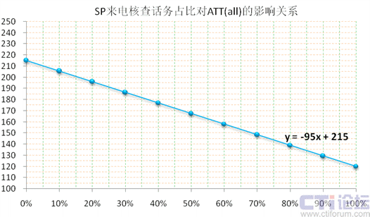 我們把話務(wù)構(gòu)成簡單化,假設(shè)只有“來電核查”和“Inbound”兩大隊(duì)列,在上下6%的波動(dòng)范圍內(nèi),取ATT(sp)=120秒,ATT(in)=215秒,“SP來電核查”話務(wù)占比=x,則“Inbound”話務(wù)占比=1-x,ATT(all)=y(tǒng),整體通話均長y與“SP來電核查”話務(wù)占比x存在如下線性關(guān)系:(下圖13)