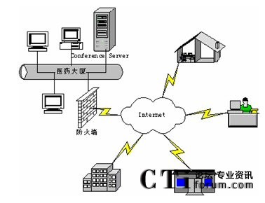視頻會議服務(wù)器設(shè)置在上海總部,通過電信的6M帶寬接入互聯(lián)網(wǎng),并配備有廣域網(wǎng)靜態(tài)IP地址。下屬生產(chǎn)基地和分支機構(gòu)通過電信ADSL接入和光纖接入等方式接入互聯(lián)網(wǎng)。這些點能夠?qū)崿F(xiàn)網(wǎng)絡(luò)視頻會議通訊,進行音頻、視頻和數(shù)據(jù)的多方溝通。