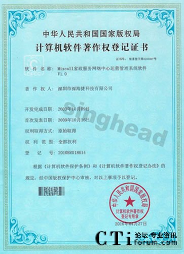 CTI論壇(ctiforum)5月19日消息(記者 楊佳林):2010年4月27日,深圳市深海捷科技有限公司申請(qǐng)的《Mixcall家政服務(wù)網(wǎng)絡(luò)中心運(yùn)營管理系統(tǒng)軟件V1.0》著作登記獲得國家版權(quán)局審核并通過。