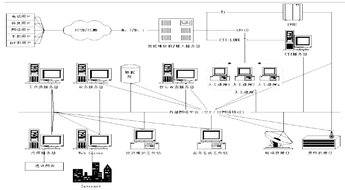 客戶服務中心系統(tǒng)包含智能排隊機(含接入服務器)、核心服務器CCS、交互式語音應答系統(tǒng)IVR、語音傳真服務器、業(yè)務服務器、工作流服務器、數(shù)據(jù)庫服務器、Internet/Intranet服務器、人工座席、尋呼機接口,手機短消息接口等組成。如下圖所示為Runsun呼叫中心系統(tǒng)結(jié)構(gòu)圖: