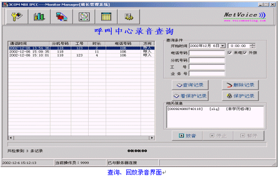 NetVoice作為3Com NBX網(wǎng)絡(luò)電話產(chǎn)品中國區(qū)總分銷,在積累大量3Com IPCC開發(fā)應(yīng)用經(jīng)驗的基礎(chǔ)上,通過對3Com NBX產(chǎn)品技術(shù)特性的詳盡分析,并結(jié)合其它錄音產(chǎn)品的成功開發(fā)經(jīng)驗,成功的在3Com