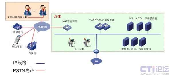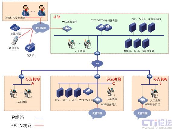 分支機(jī)構(gòu)B:網(wǎng)絡(luò)通過(guò)VPN技術(shù)與總部實(shí)現(xiàn)數(shù)據(jù)語(yǔ)音傳輸,部署MSR語(yǔ)音網(wǎng)關(guān)與當(dāng)?shù)豍STN網(wǎng)連接,IP坐席。兩地申請(qǐng)相同的客服號(hào)碼,兩地內(nèi)撥打客服號(hào)碼,客戶無(wú)長(zhǎng)途話費(fèi)產(chǎn)生。適用與總部與分支處在不同省市。