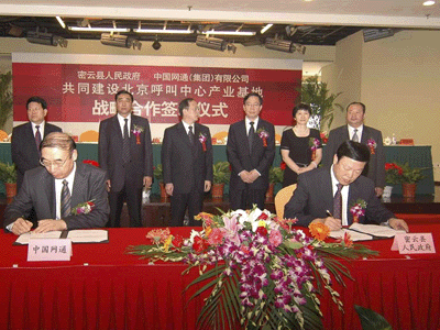 簽約儀式在密云瑞海姆田園度假村舉行,雙方就共建北京呼叫中心產(chǎn)業(yè)基地項目簽訂了《共同建設(shè)北京呼叫中心產(chǎn)業(yè)基地戰(zhàn)略合作協(xié)議》,北京市副市長茍仲文同志、中國網(wǎng)通(集團)有限公司董事長兼總裁左迅生、副總裁姜正新,北京市發(fā)展改革委、規(guī)劃委等市政府相關(guān)部門、密云縣人民政府、中國網(wǎng)通(集團)有限公司以及多家新聞媒體共計100余人參加了儀式。