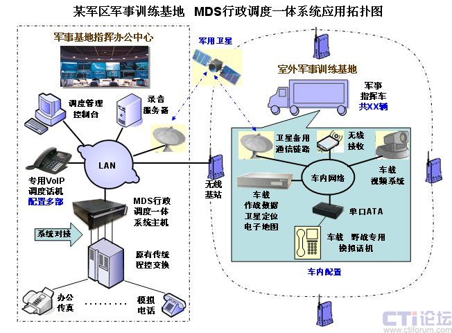 為了加強現(xiàn)代化軍隊的建設(shè),某軍區(qū)在其軍分區(qū)的指揮訓(xùn)練基地,使用先進的技術(shù),搭建了一套由幾十輛軍事指揮車組成的作戰(zhàn)指揮訓(xùn)練系統(tǒng),其中的語音通信指揮系統(tǒng)部分,采用了美國Zed-3公司最先進的基于IP技術(shù)的MDS80行政調(diào)度一體化通信系統(tǒng),解決了訓(xùn)練基地的指揮中心大樓的原有通信系統(tǒng),與室外的訓(xùn)練基地各輛指揮車之間,通過基地?zé)o線網(wǎng)絡(luò)及衛(wèi)星備份鏈路提供的IP通道,實現(xiàn)語音的指揮調(diào)度通信,達到訓(xùn)練基地要求的最佳的語音指揮調(diào)度通信效果。