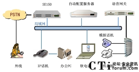 此方案適用于已經(jīng)部署了傳統(tǒng)PBX的企業(yè)。要求企業(yè)部署好數(shù)據(jù)網(wǎng)絡(luò),如果采用模擬終端,則企業(yè)的各個辦公點(diǎn)需要先將網(wǎng)絡(luò)線路和電話線路部署到位,同時企業(yè)原有的PBX要預(yù)留與SE150對接的接口。