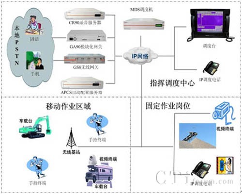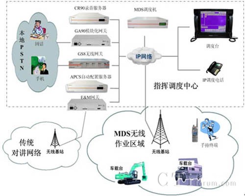 MDS系統(tǒng)可以應(yīng)用于各種作業(yè)現(xiàn)場(chǎng)的指揮調(diào)度, MDS系統(tǒng)不但支持系統(tǒng)基本的語(yǔ)音通信,調(diào)度中心可以通過(guò)視頻、數(shù)據(jù)、文本消息等綜合的多媒體方式與作業(yè)人員進(jìn)行通信交互,滿足各種復(fù)雜環(huán)境下的指揮調(diào)度需求。系統(tǒng)可以通過(guò)GS8無(wú)線網(wǎng)關(guān)、GA90