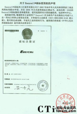 CTI論壇(ctiforum)07月31日消息: 近日,杭州三匯軟件有限公司就Easycall®商標(biāo)使用權(quán)作出聲明,聲明全文如下:
