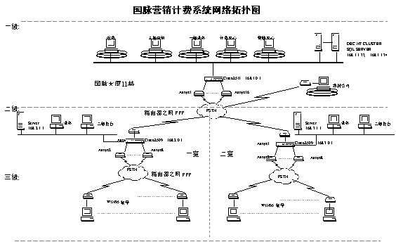 一級(jí)為計(jì)費(fèi)中心,位于國(guó)脈大廈內(nèi),作為整個(gè)系統(tǒng)的運(yùn)行中心和數(shù)據(jù)中心,也是整個(gè)系統(tǒng)的樞紐。二級(jí)主要位于二個(gè)營(yíng)業(yè)室,是整個(gè)系統(tǒng)的分中心。三級(jí)為各營(yíng)業(yè)所和代銷(xiāo)點(diǎn),分散在全市各處是整個(gè)系統(tǒng)的數(shù)據(jù)基礎(chǔ)。
