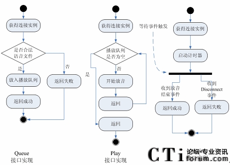 在實現(xiàn)過程中,本文設(shè)計的IVR系統(tǒng)只是涉及到語音文件的播放,所以只是需要通過調(diào)用語音卡API將語音文件放入播放隊列即可,而需要重復(fù)播放的語音文件,只要重復(fù)放入到語音隊列當(dāng)中便可實現(xiàn)。