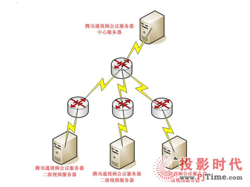 整套視頻系統(tǒng)基于原有IP數(shù)據(jù)網(wǎng)絡,在中心機房建立視騰訊通視頻系統(tǒng)中心服務器,負責二級服務器的連接及控制,用戶數(shù)據(jù)和會議數(shù)據(jù)采用虛擬服務器管理技術,即在不同的虛擬服務器的用戶和會議數(shù)據(jù)不能相互看到,當需要召集不同虛擬服務器用戶的會議時通過管理員進入后臺召集跨虛擬服務器的會議,以實現(xiàn)各個單位之間的大會議的需求。這樣既能快速召開部門內小型視頻會議,同時又能分別在各省市支部召開區(qū)域型的大型會議。