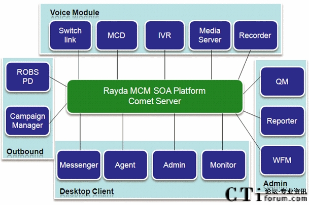 Rayda MCM多渠道呼叫管理平臺(tái),是呼叫中心基礎(chǔ)呼叫業(yè)務(wù)的信息化支撐平臺(tái)系統(tǒng)。Rayda MCM以先進(jìn)的呼叫信息交互為核心,涵蓋呼叫中心系統(tǒng)所必須的ACD、IVR、PD、錄音、質(zhì)檢等基本功能,更整合了統(tǒng)一通信、電話營銷等多項(xiàng)企業(yè)迫切需要的功能。MCM支持支持從板卡、傳統(tǒng)PBX到IPPBX網(wǎng)絡(luò)等各種接入方式的建設(shè),支持從單點(diǎn)到分布式等各種組網(wǎng)方式,適應(yīng)從中小企業(yè)到外包型等各種規(guī)模呼叫中心的需求。