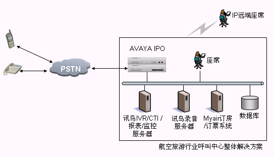 本方案采用AVAYA IP OFFICE系列交換機,通過訊鳥中間件控制整個呼叫中心的電話呼入、呼出。它支持多種聯絡渠道,包括語音、交互式自動語音應答(IVR)、傳真、電子郵件、web、短消息等,同時利用Myair航空管理系統(tǒng)來完成整個業(yè)務流程。
